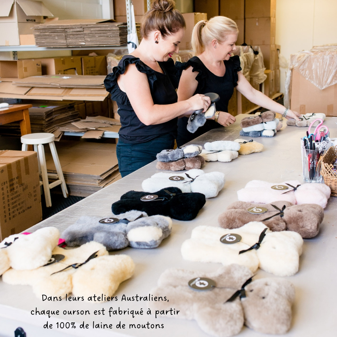 Prue & Sarah : L’authenticité, la qualité et le soin. Chaque ours est fabriqué à la main en peau de mouton 100 % australienne, un matériau naturel et durable. Nous sommes restées une petite entreprise familiale, fidèles à nos racines, et nous voulons que les familles puissent avoir une totale confiance en nos produits.